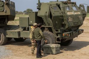 Philippine President Ferdinand “Bongbong” Marcos Jr. inspects a high mobility artillery rocket system (HIMARS) beside a U.S. soldier before a live fire exercise in the annual joint military exercises between U.S. and Philippine troops called “Balikatan” or shoulder-to-shoulder, held in San Antonio, Zambales province, Philippines, April 26, 2023. REUTERS/Eloisa Lopez
