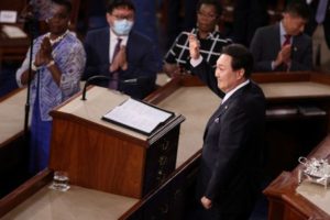 South Korea’s President Yoon Suk Yeol waves as he concludes his address to a joint meeting of the U.S. Congress in the House Chamber at the U.S. Capitol in Washington, U.S. April 27, 2023. REUTERS/Julia Nikhinson