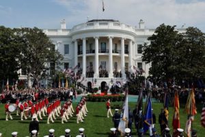 U.S. President Joe Biden and South Korea’s President Yoon Suk Yeol look on as members of the U.S. military parade during an official White House State Arrival Ceremony on the South Lawn of the White House in Washington, U.S. April 26, 2023. REUTERS/Jonathan Ernst