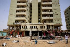 A man walks past near a damaged car and buildings at the central market during clashes between the paramilitary Rapid Support Forces and the army in Khartoum North, Sudan April 27, 2023. REUTERS/ Mohamed Nureldin Abdallah