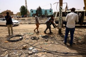 Electricity workers rehabilitate the power lines at the central market during clashes between the paramilitary Rapid Support Forces and the army in Khartoum North, Sudan April 27, 2023. REUTERS/ Mohamed Nureldin Abdallah