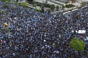 An aerial view shows right-wing demonstrators at a protest calling on the Israeli government to complete its planned judicial overhaul, in front of the Knesset, Israel’s Parliament, in Jerusalem, April 27, 2023. REUTERS/Ilan Rosenberg