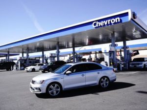 FILE PHOTO: A Volkswagen vehicle drives past the fuel pumps at Terrible’s Road House, the world’s largest Chevron gas station, in Jean, Nevada, U.S., February 27, 2022. REUTERS/Bing Guan