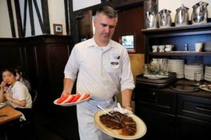 FILE PHOTO: A waiter serves steak at Peter Luger Steak House in Brooklyn, New York City, U.S., August 12, 2021. REUTERS/Andrew Kelly/File Photo