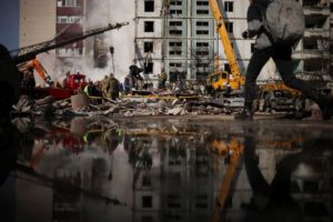 Local residents and rescuers stand amidst the rubble at the site of a heavily damaged residential building hit by a Russian missile, amid Russia’s attack on Ukraine, in the town of Uman, Cherkasy region, Ukraine April 28, 2023. REUTERS/Carlos Barria