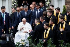 Pope Francis leaves the Greek Catholic Church of the Intercession of the Theotokos after meeting with the Greek Catholic community, during his apostolic journey in Budapest, Hungary, April 29, 2023. REUTERS/Bernadett Szabo