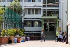 A group of people are gathered in front of the school entrance next to items taken out of the building after Poland seized the Russian embassy school in Warsaw, Poland, April 29, 2023. REUTERS/Kuba Stezycki