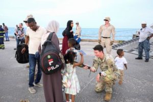 A U.S. military member uses a metal detector, while American nationals arrive for evacuation from the port, as clashes between the paramilitary Rapid Support Forces and the Sudanese army continue, in Port Sudan, Sudan, April 30, 2023. REUTERS/Stringer