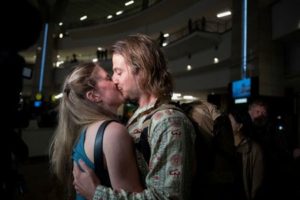 Jonathan Hainsworth, a South African citizen evacuated from Sudan to escape the conflict, is greeted by his partner Lara Broderick after his arrival back home at O.R. Tambo International Airport in Johannesburg ,South Africa April 29, 2023. REUTERS/Ihsaan Haffejee