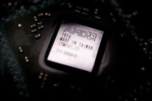 FILE PHOTO: The logo of semiconductor company Advanced Micro Devices Inc (AMD) is seen on a graphics processing unit (GPU) chip in this illustration picture taken February 17, 2023. REUTERS/Florence Lo/Illustration/File Photo