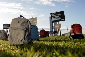 Members of Avaaz, a global web movement, protest in front of National Congress using backpacks to represent victims of school massacres lost due to lack of laws in the virtual world, in Brasilia, Brazil May 2, 2023. REUTERS/Ueslei Marcelino