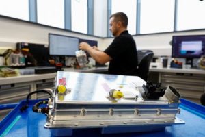 The inverter that was used for the EQXX, Mercedes’ long-range concept electric car, is shown at the headquarters of Mercedes AMG High Performance Powertrains, which designs and builds powertrains for the German carmaker’s Formula One team, in Brixworth, Northamptonshire, Britain March 7, 2023. REUTERS/Andrew Boyers