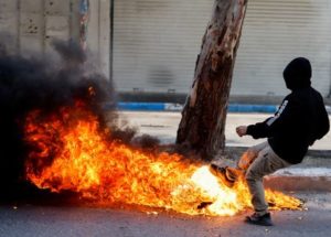 A Palestinian kicks a burning object during clashes between Palestinians and Israeli soldiers following the death of Palestinian prisoner Khader Adnan during a hunger strike in an Israeli jail, in Hebron in the Israeli-occupied West Bank May 2,2023. REUTERS/Mussa Issa Qawasm