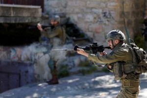 An Israeli soldier shoots rubber bullets at Palestinians during clashes following the death of Palestinian prisoner Khader Adnan during a hunger strike in an Israeli jail, in Hebron in the Israeli-occupied West Bank May 2,2023. REUTERS/Mussa Issa Qawasma