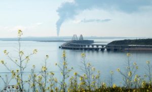 A view across the Kerch Strait shows smoke rising above a fuel depot near the Crimean bridge in the village of Volna in Russia’s Krasnodar region as seen from a coastline in Crimea, May 3, 2023. REUTERS/Stringer