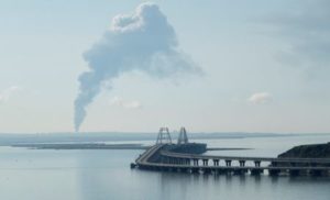 A view across the Kerch Strait shows smoke rising above a fuel depot near the Crimean bridge in the village of Volna in Russia’s Krasnodar region as seen from a coastline in Crimea, May 3, 2023. REUTERS/Stringer