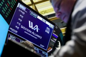 FILE PHOTO: A screen displays the logo and trading info for Western Alliance Bancorporation on the floor of the New York Stock Exchange (NYSE) in New York City, U.S., March 14, 2023. REUTERS/Brendan McDermid