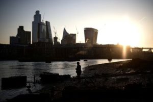 FILE PHOTO: A person stands on the bank of the River Thames during sunrise, with the City of London financial district in the background, in London, Britain, April 4, 2023. REUTERS/Henry Nicholls