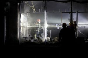 Firefighters work at a site of a building damaged by the remains of a shot-down drone, amid Russia’s attack on Ukraine, in Kyiv, Ukraine May 4, 2023. REUTERS/Alina Smutko