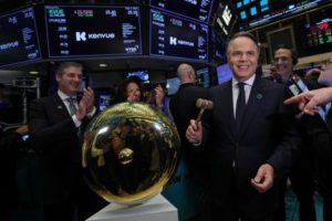 Thibaut Mongon, CEO of Kenvue Inc. Johnson & Johnson’s consumer-health business, rings a ceremonial bell to celebrate the opening trade during the company’s IPO at the New York Stock Exchange (NYSE) in New York City, U.S., May 4, 2023. REUTERS/Brendan McDermid