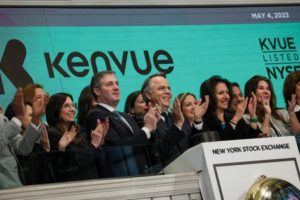 Thibaut Mongon, CEO of Kenvue Inc. a Johnson & Johnson’s consumer-health business, rings the opening bell to celebrate it’s IPO at the New York Stock Exchange (NYSE) in New York City, U.S., May 4, 2023. REUTERS/Brendan McDermid