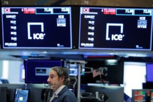 A trader walks below screens showing the current price of Intercontinental Exchange (ICE) on the floor of the New York Stock Exchange (NYSE) in New York, U.S., March 20, 2020. REUTERS/Lucas Jackson