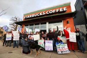 FILE PHOTO: Starbucks workers attend a rally as they go on a one-day strike outside a store in Buffalo, New York, U.S., November 17, 2022. REUTERS/Lindsay DeDario/File Photo