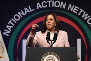 FILE PHOTO: U.S. Vice President Kamala Harris speaks during the National Action Network Convention in New York, U.S., April 14, 2023. REUTERS/Jeenah Moon