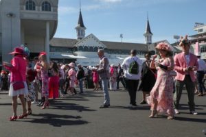 Spectators watch the race on a screen before they arrive at their seats, a day ahead of the 149th Kentucky Derby, at Churchill Downs Louisville, Kentucky, U.S., May 5, 2023. REUTERS/Amira Karaoud