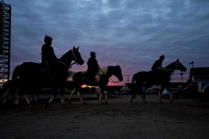 May 6, 2023; Louisville, KY, USA; Warm up riders return to the barns after running horses at Churchill Downs before the 149th annual Kentucky Derby on Saturday, May 6, 2023, in Louisville, Ky. Mandatory Credit: Albert Cesare-USA TODAY Sports