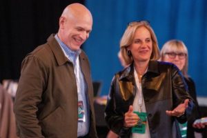 Susan Decker, a director at Berkshire Hathaway, chats with investors at the company’s annual shareholders’ meeting in Omaha, Nebraska, U.S. May 6, 2023. REUTERS/Rachel Mummey