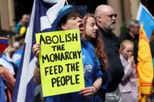 A person holds a placard during a Scottish Independence march which is at the same time as the coronation of Britain’s King Charles and Queen Camilla, in Glasgow, Scotland, Britain, May 6, 2023 REUTERS/Russell Cheyne