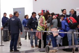 Undocumented migrants from Venezuela who were in limbo at Chile-Peru border, stand while they board a special homecoming flight to Venezuela from Arica airport, Chile May 7, 2023. REUTERS/Alexander Infante