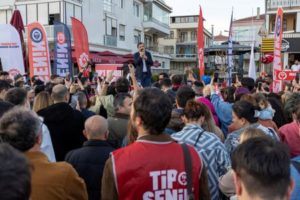 Erkan Bas, the leader of Workers’ Party of Turkey (TIP), speaks during a campaign event ahead of the May 14 presidential and parliamentary elections, in Istanbul, Turkey May 8, 2023. REUTERS/Umit Bektas