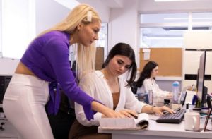 FILE PHOTO: Berivan, a 21-year-old who works at a textile company, and her colleague Ebru work in their office in Istanbul, Turkey, April 24, 2023. REUTERS/Umit Bektas