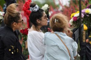 Mother, Sara Tabatabaei, daughter Lenna Maleki and aunt Mahboubeh Gargvand, help erect a memorial to honor those who lost their lives on Saturday when a gunman shot multiple people at the Dallas-area Allen Premium Outlets mall, in Allen, Texas, U.S. May 7, 2023. REUTERS/Jeremy Lock