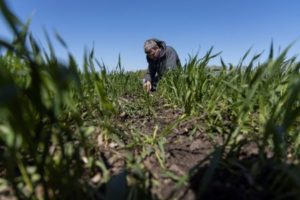 Dutch farmer Kees Huizinga checks the results of grain sowing