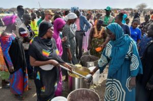 FILE PHOTO: Civilians who fled the war-torn Sudan following the outbreak of fighting between the Sudanese army and the paramilitary Rapid Support Forces (RSF) receive food rations at the United Nations High Commissioner for Refugees (UNHCR) transit centre in Renk, near the border crossing point in Renk County of Upper Nile State, South Sudan May 1, 2023. REUTERS/Jok Solomun