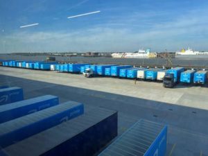 Amazon trucks are seen lined up next to the Thames river, at an Amazon warehouse, which opened in August 2021, in Dartford, Kent, Britain May 3, 2023. REUTERS/Helen Reid