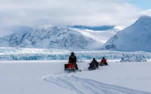 FILE PHOTO: Scientists ride their snowmobiles near Kronebreen glacier through the arctic landscape near Ny-Alesund, Svalbard, Norway, April 10, 2023. REUTERS/Lisi Niesner/File Photo