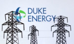 FILE PHOTO: Electric power transmission pylon miniatures and Duke Energy logo are seen in this illustration taken, December 9, 2022. REUTERS/Dado Ruvic/Illustration
