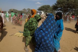 Sudanese women, who fled the violence in their country and who were waiting desperately for food distribution, dodge the soldiers attempting to hold them back as they tried to grab bags of provision when they saw that supplies brought by a Turkish aid group (IHH) were running out, near the border between Sudan and Chad in Koufroun, Chad May 7, 2023. REUTERS/Zohra Bensemra