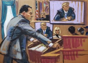 Joe Tacopina, lawyer of former U.S. President Donald Trump, makes closing arguments during a civil trial where former Elle magazine advice columnist E. Jean Carroll accuses Trump of raping her in a department store dressing room in the mid-1990s, and of defamation, in New York, U.S., May 8, 2023 in this courtroom sketch. REUTERS/Jane Rosenberg