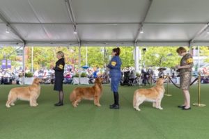 Golden Retrievers stand in the judging ring during the 147th Westminster Kennel Club Dog Show at the USTA Billie Jean King National Tennis Center in New York, U.S., May 9, 2023. REUTERS/Jeenah Moon