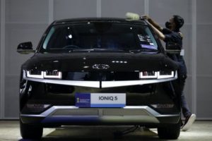 FILE PHOTO: A worker cleans a Hyundai IONIQ 5 electric car during Indonesia International Motor Show in Jakarta, Indonesia, February 16, 2023. REUTERS/Willy Kurniawan