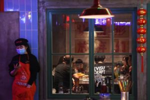 FILE PHOTO: A staff member stands outside of a room where people dine at a hotpot restaurant in Beijing, China April 8, 2022. REUTERS/Tingshu Wang