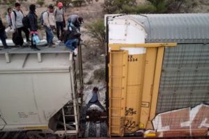 Migrants, mostly from Venezuela, climb to a wagon of a train as they get ready to continue their journey to the U.S. border in the site known as El Basurero, a stretch of land next to a trash dump and the railroad, in Huehuetoca, State of Mexico, Mexico April 26, 2023. REUTERS/Gustavo Graf