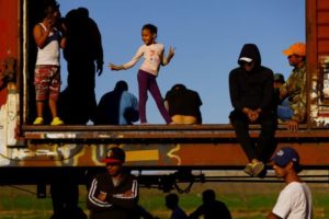 Victoria, a seven-year-old migrant girl, plays inside a carriage as she travels with her family on board the train with the intention of reaching the United States, on the outskirts of Ciudad Juarez, Mexico April 19, 2023. REUTERS/Jose Luis Gonzalez