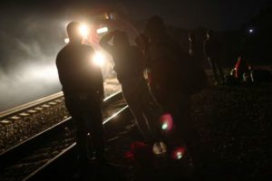 Migrants, mostly from Venezuela, watch a passing train in the site known as El Basurero, a stretch of land next to a trash dump and the railroad, as they continue their journey to the U.S. border, in Huehuetoca, State of Mexico, Mexico April 28, 2023. REUTERS/Gustavo Graf