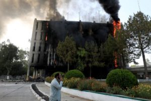 A man speaks on his mobile as fire and smoke billow from a Radio Pakistan building after it was set afire by the supporters of Pakistan’s former Prime Minister Imran Khan during a protest against his arrest, in Peshawar, Pakistan, May 10, 2023. REUTERS/Fayaz Aziz